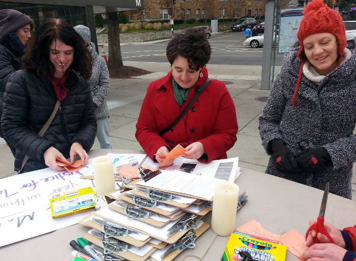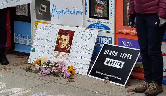 We offer you this story from a local chapter of SURJ (in Washington, DC) that integrated action with reflection and ritual as part of a public awareness campaign on November 22, 2015, National Day of Action for Tamir Rice. Given the failure of indictment of the officers involved in Tamir’s shooting, 13 months after his death, it is all the more important to keep Tamir’s story alive in public conversation. Black Lives Matter organizers are currently meeting in Cleveland, to plan their response, and Color of Change is launching a campaign to move prosecutors like Timothy J. McGinty out of office. What will be our response?
